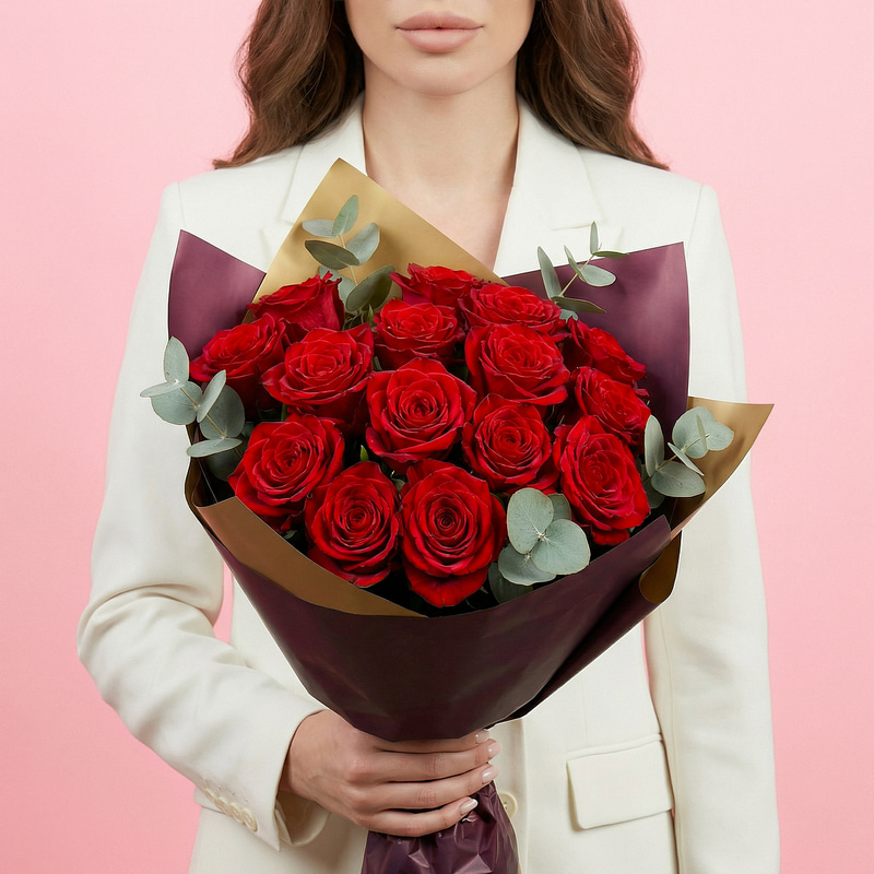 15 красных роз и эвкалипт