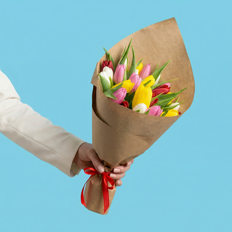 Классический букет из 25 тюльпанов, разных сортов и оттенков в экологичной крафт упаковке