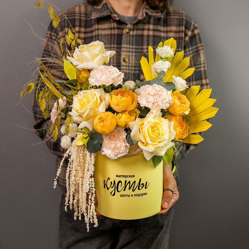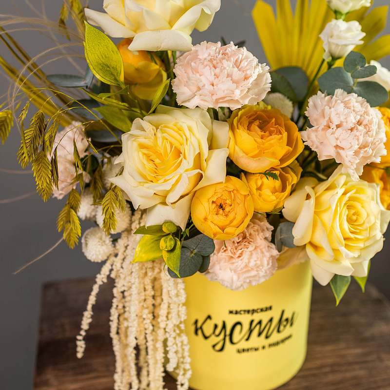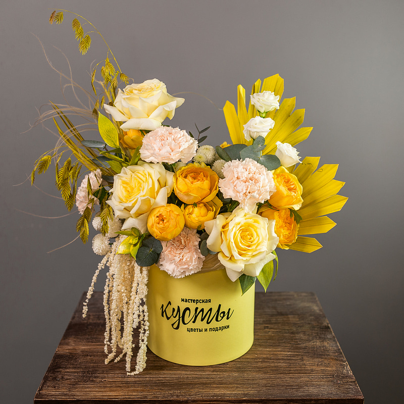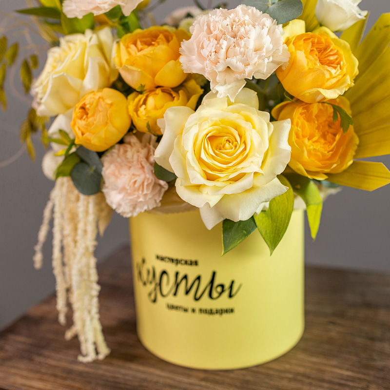 Яркая композиция в шляпной коробке в желтой гамме. Универсальный подарок подходящий для любых поводов и случаев!