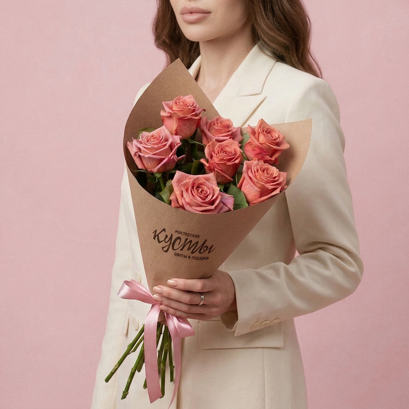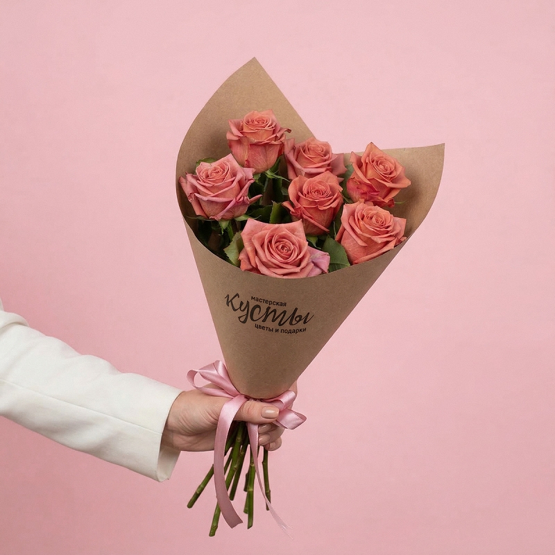 Экологичный букет в стильной крафт упаковке с трендовыми розами сорта "Barista"