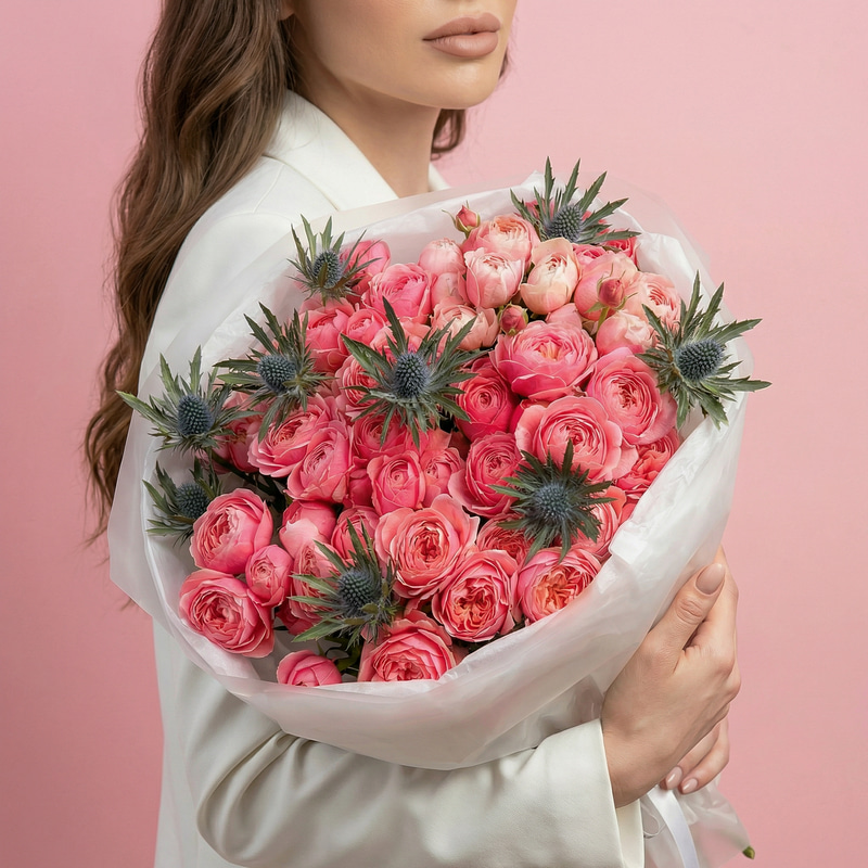 Воплощение утончённой нежности и современной элегантности: пышные розовые кустовые розы в сочетании с выразительным эрингиумом создают эффектный, запоминающийся образ. Воздушная упаковка подчеркивает его премиальный характер, делая композицию идеальным подарком для признания в чувствах, дня рождения или особенного момента без повода. Он словно создан для того, чтобы восхищать с первого взгляда и дарить ощущение роскоши, заботы и искреннего внимания.