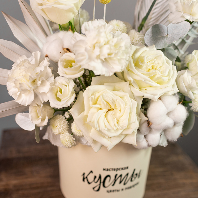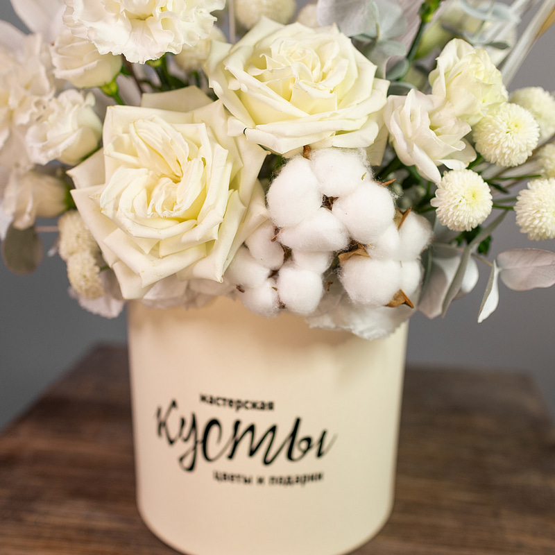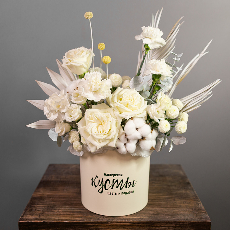 Светлая композиция в шляпной коробке в белой гамме. Универсальный подарок подходящий для любых поводов и случаев!