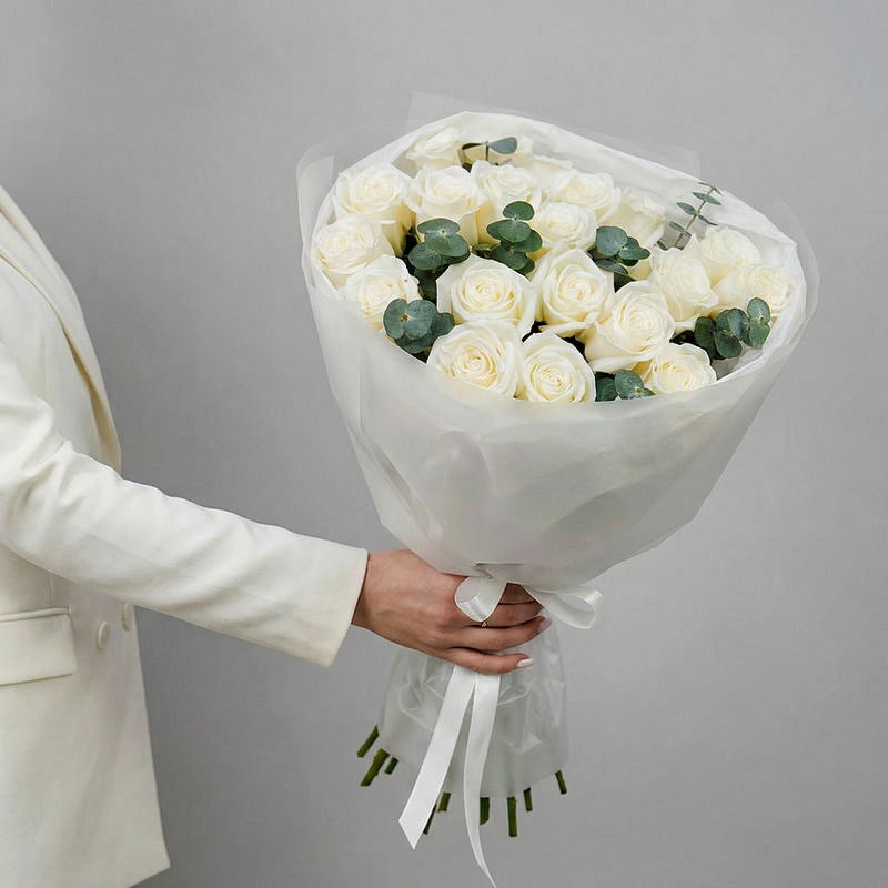 Стильный букет небольшого размера в упаковке с белыми розами и эвкалиптом. Классика жанра!