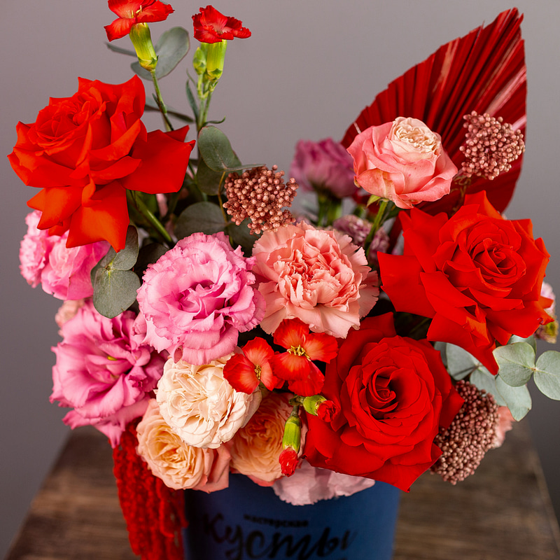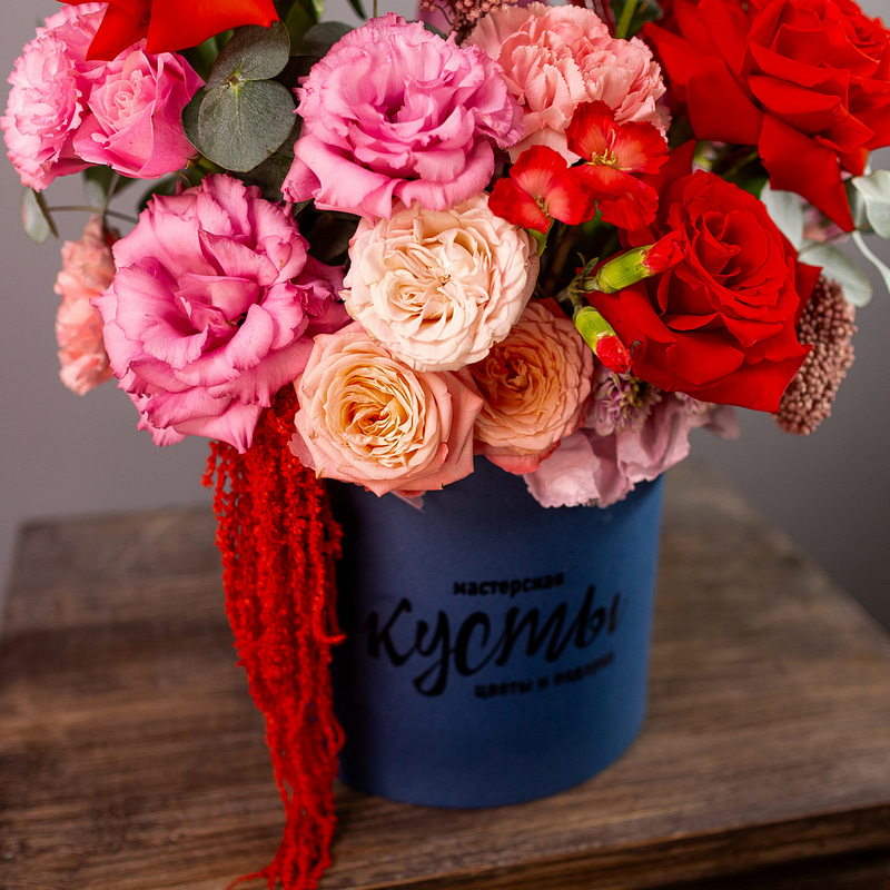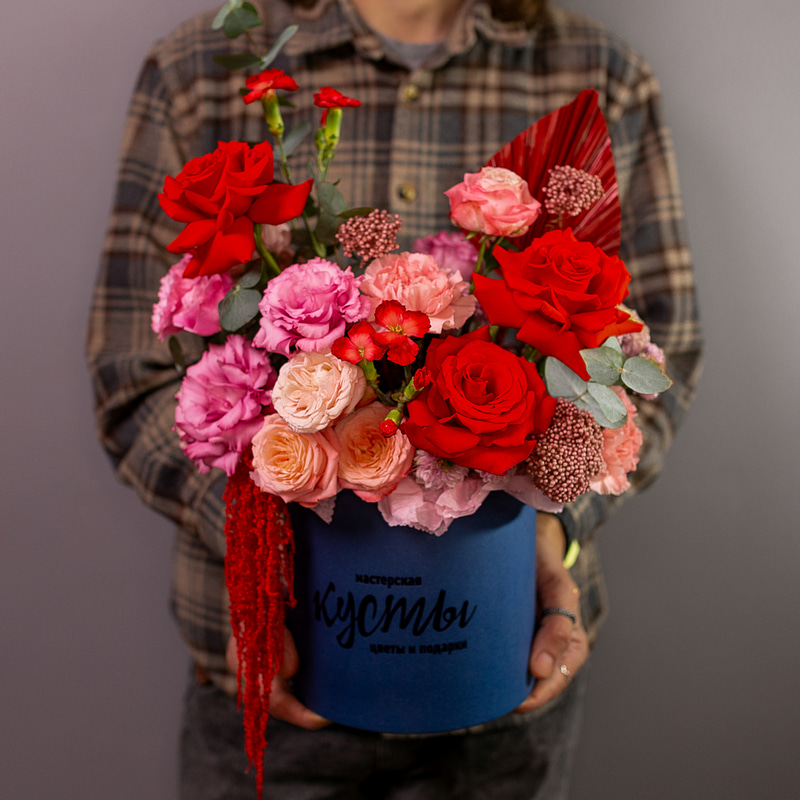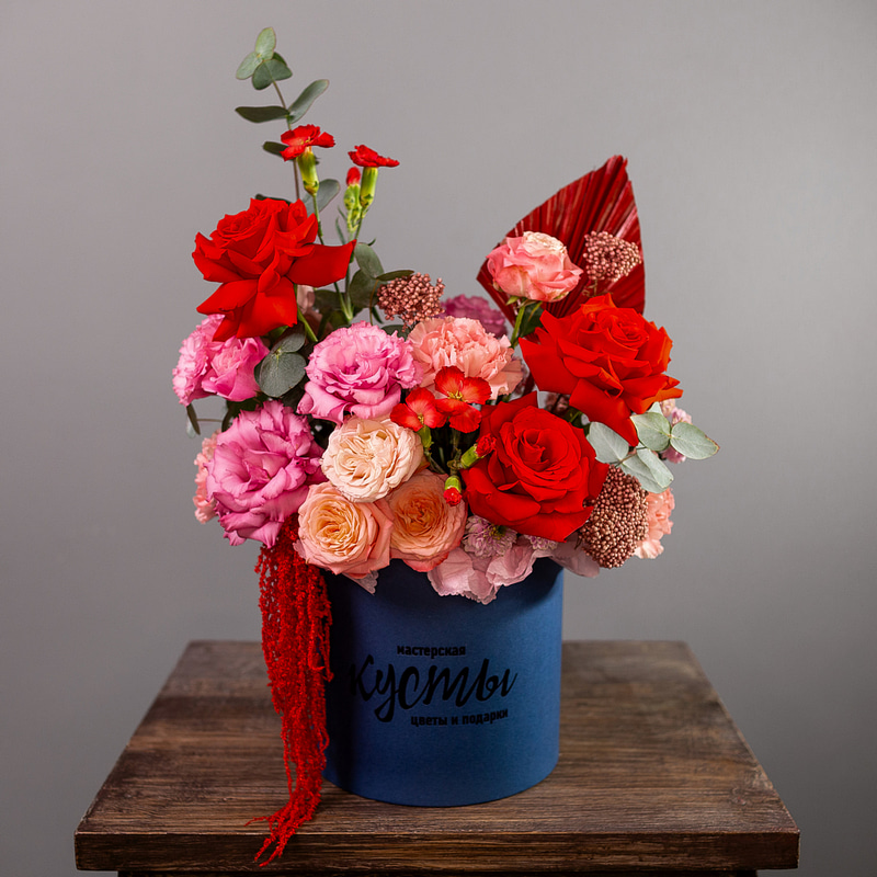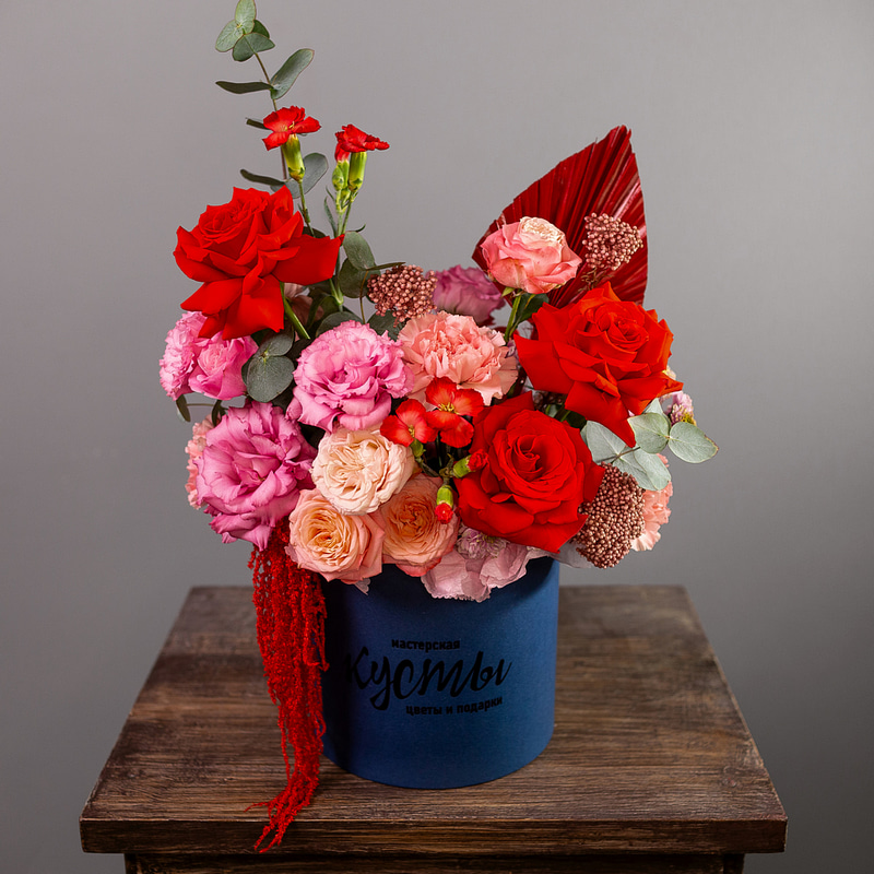 Яркая и контрастная композиция в шляпной коробке в красно-синей гамме. Универсальный подарок подходящий для любых поводов и случаев!